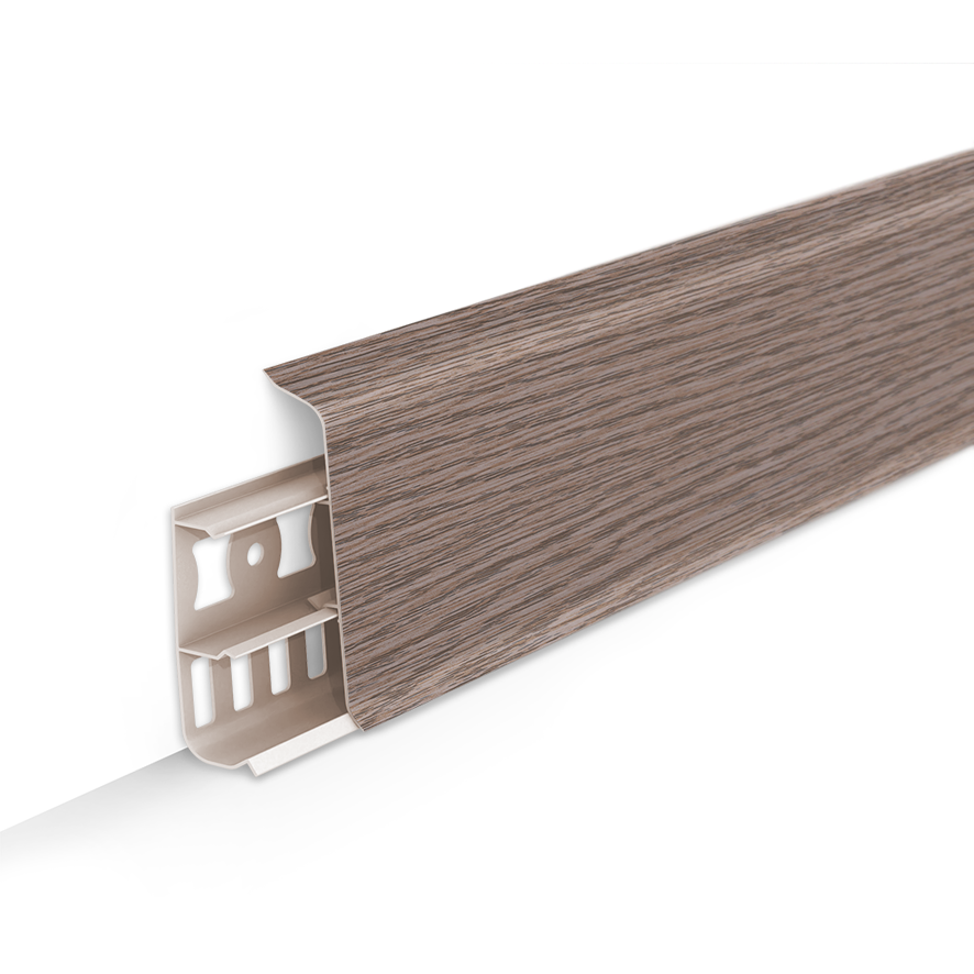 Дизайнерская серия напольного плинтуса со скошенными прямыми углами среднего размера 7 см., подходит абсолютно для всех видов помещений, большой ассортимент цветов позволяет определенно точно подобрать материал под дизайн интерьера и напольные покрытия.