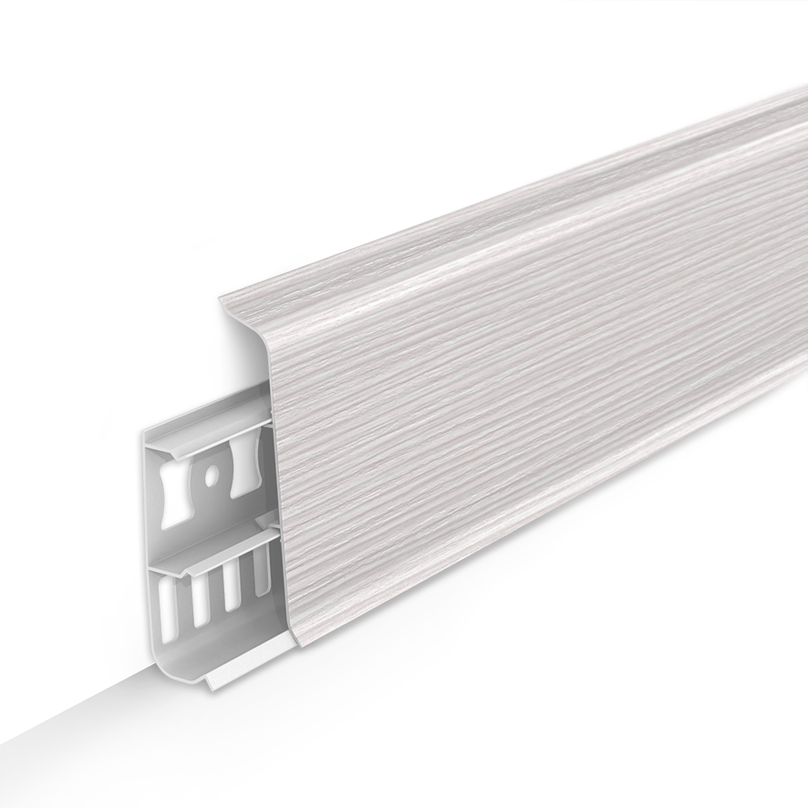 Дизайнерская серия напольного плинтуса со скошенными прямыми углами высотою 8.5 см., подходит абсолютно для всех видов помещений, большой ассортимент цветов позволяет определенно точно подобрать материал под дизайн интерьера и напольные покрытия.