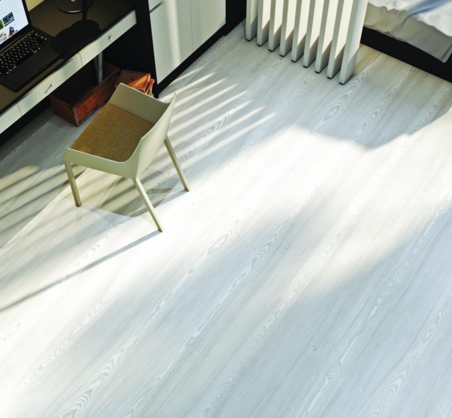 Рисунок поверхности доски выполнен в светло-серых оттенках и эффектно имитирует натуральные древесные волокна. Такой вид ламината широко используется в современных интерьерах и хорошо сочетается с разными видами обоев.