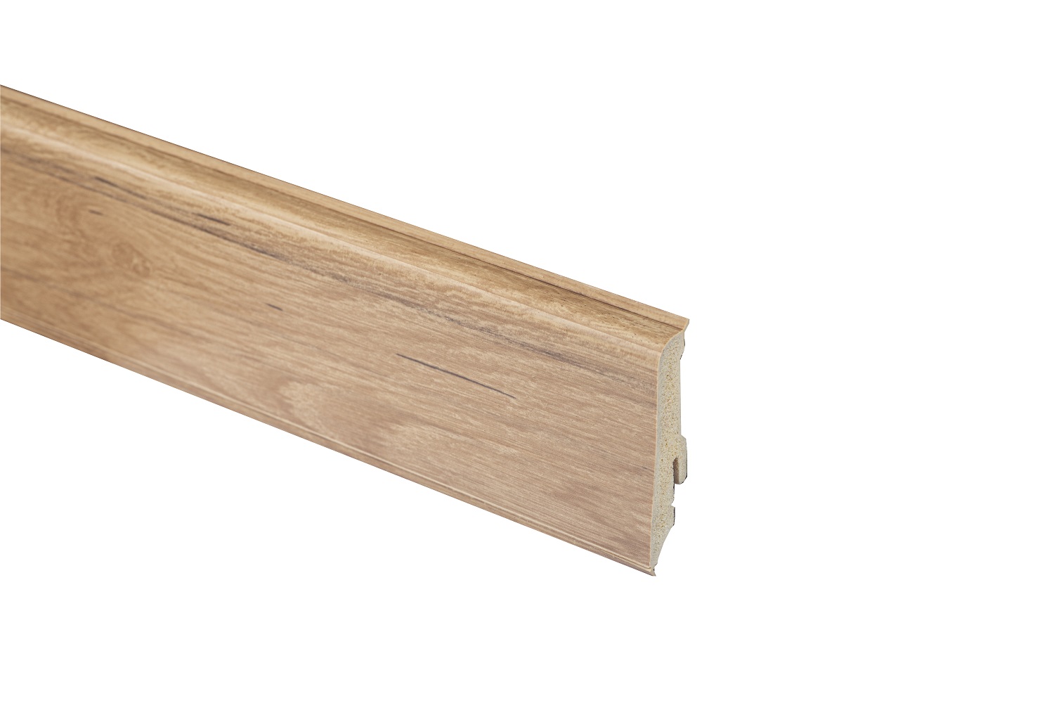 Главная особенность плинтусов Neuhofer Holz — наличие эластичных кромок сверху и снизу. Они не дают влаге попасть за плинтус, а также выравнивают неровности от 1 мм до 1,5 мм у стен и пола.