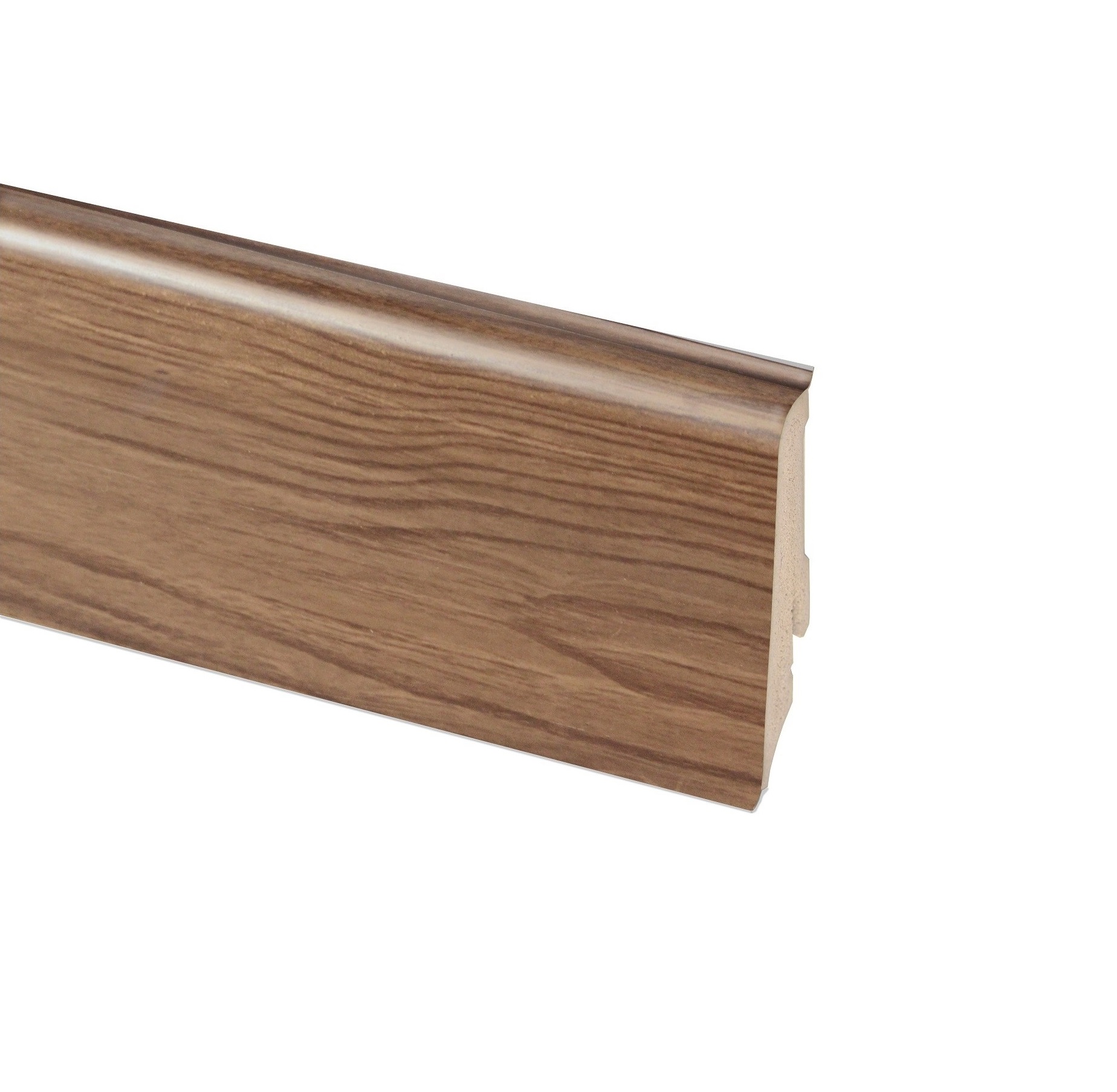 Главная особенность плинтусов Neuhofer Holz — наличие эластичных кромок сверху и снизу. Они не дают влаге попасть за плинтус, а также выравнивают неровности от 1 мм до 1,5 мм у стен и пола.